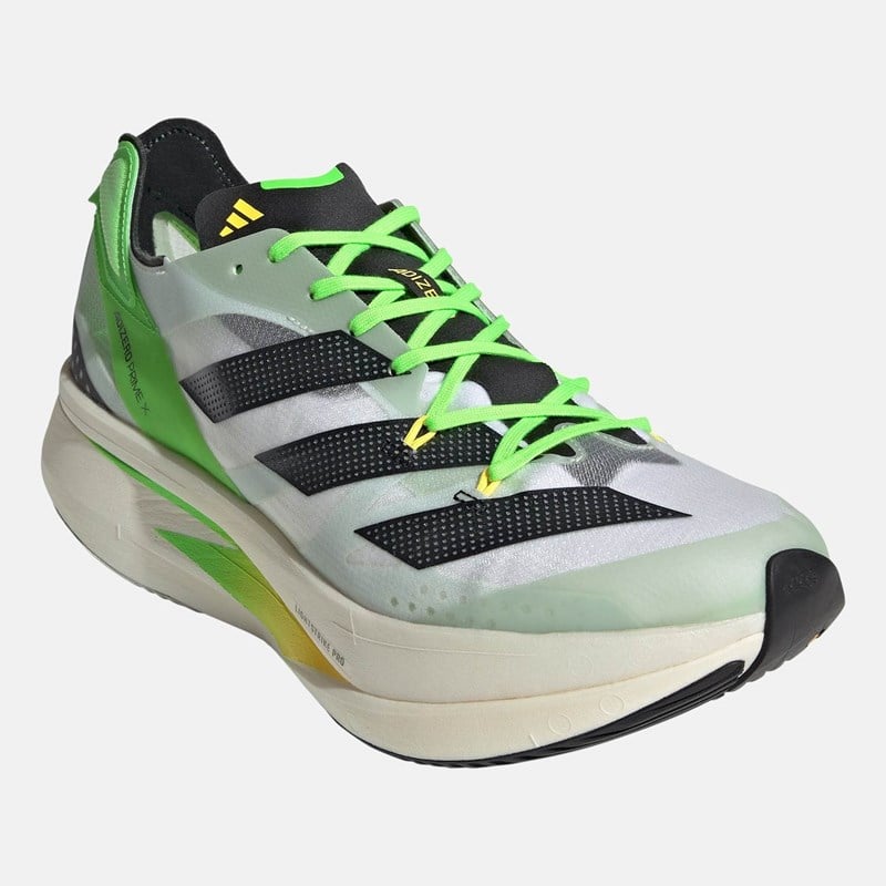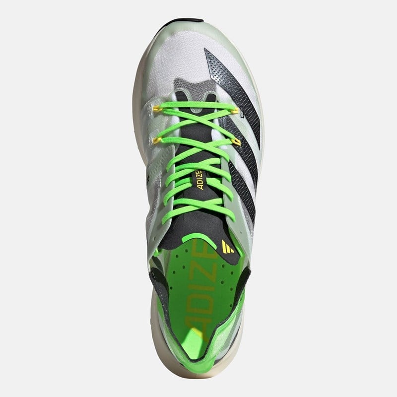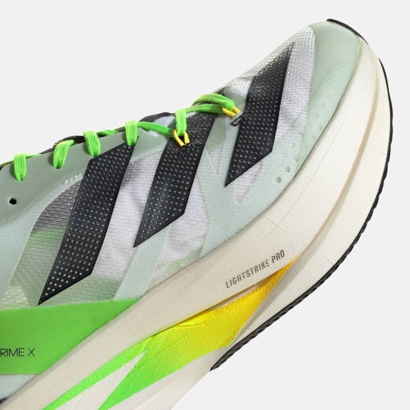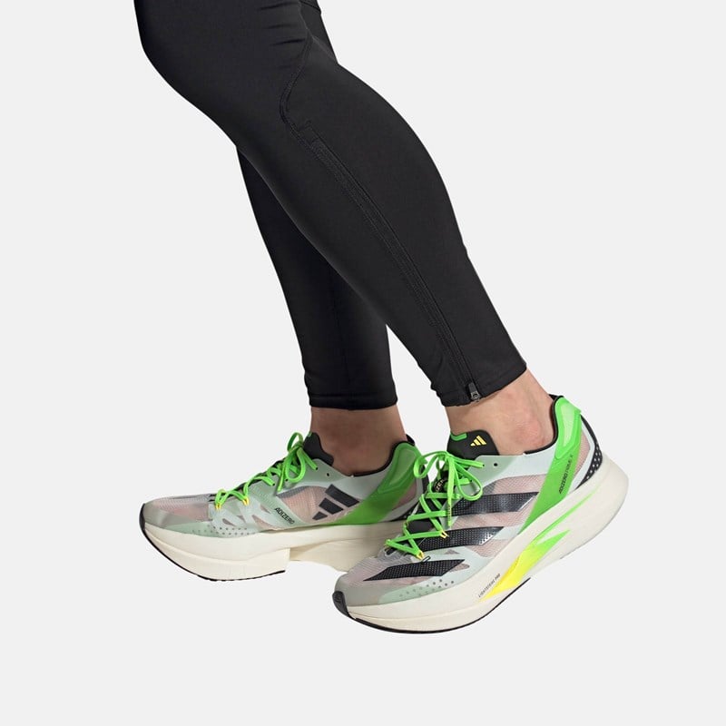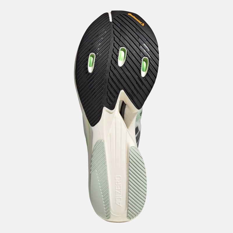 Adizero променят значението на скоростта. Тези обувки за бягане на Adidas са създадени, за да подобрят личния ви рекорд. Каква е тяхната тайна? Съчетават иновативни технологии и данни от спортисти. Три слоя с технология Lightstrike Pro за поглъщане на удари, ENERGYRODS и Energyblades, се срещат с ултралеката мрежеста горна част, за да направят постигането на целите ви лесно.Изработени са от рециклирани материали, като горната част е изработена от поне 50% рециклирано съдържание. Този продукт представлява само едно от нашите решения за премахване на пластмасовите отпадъци.Детайли:Текстилна горна част. Горната част съдържа поне 50% рециклирано съдържание.Lightstrike Pro: Най-добрата технология за поглъщане на удари, налична в обувките за бягане на adidas, с тройната издръжлива пяна LIGHTSTRIKE PRO, която връща енергията, за да осигури най-доброто изживяване при бягане.Иновативна карбонова технология, която съчетава анатомични ENERGYRODS с допълнителни карбонови остриета, които осигуряват тласъкSlinglaunch Heel: Олекотената конструкция на петата осигурява перфектно стабилно прилягане, за да предпази крака от приплъзване.Тегло: 251 г (размер EUR: 42 2/3).Дроп: 8,5 мм (пета: 50 мм / пръсти: 41,5 мм)Външна подметка от каучук